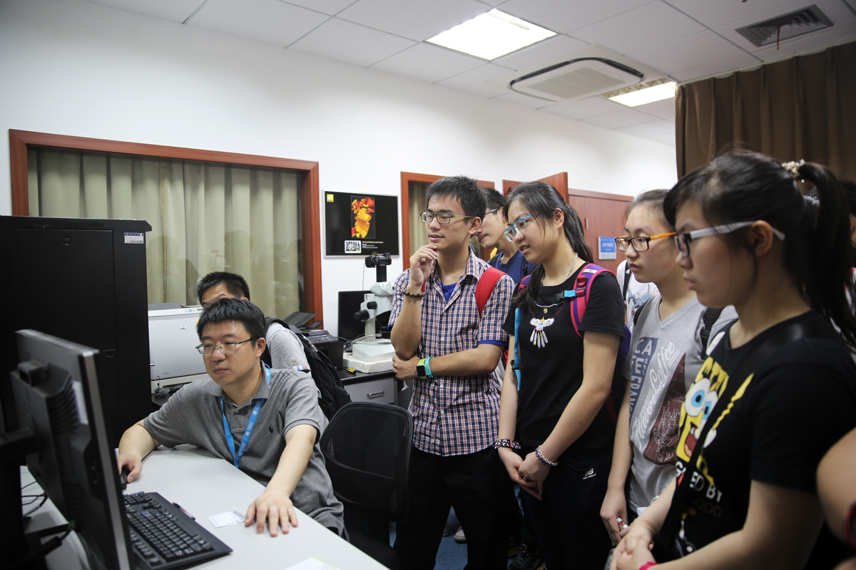 当天上午,实验室主任郑平教授向前来参观的上海市育才中学的同学们做了题为“人类智能的神经基础”的科普讲座,深入浅出的向同学们揭示了脑的奥秘,解析了人类的基本神经活动、精神活动、脑的高级功能、脑科学涉及的领域,介绍了人工智能类脑的基本要素和功能。精彩的报告开阔了同学们的视野,激发了同学们探索科学的兴趣,同学们兴致盎然、踊跃提问。讲座结束后,公共技术平台负责人姜民博士带领大家参观了重点实验室公共技术平台的软硬件设施及尼康生物影像中心的高端显微成像设备。姜民博士结合当前神经生物学实验技术的发展情况,首先向大家介绍了如水迷宫、旷场等小动物行为学常用的实验测试方法,并结合实验视频向同学们普及了相关的实验原理。随后,同学们饶有兴趣的参观了NIKON显微成像中心实验室的三台高端显微成像设备。姜民博士利用免疫荧光染色的脑片标本给大家做了实验样品的共聚焦显微成像操作,每个同学都在荧光显微镜下看到了用绿色荧光标记的神经细胞,对神经细胞的基本形态及神经网络的构成及复杂程度有了感性认识。最后在姜民博士的演示下,大家观摩了运用专业图形分析软件在专用工作站上对采集的影像数据进行3D展示,及神经网络的重构与数据分析等操作。参观结束后,大家都表示收获很大,对神经生物学实验研究的技术手段有了初步的了解并产生了浓厚的兴趣。