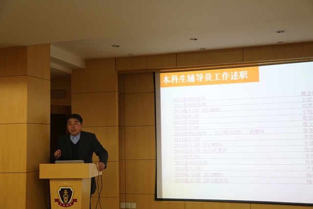 2015年12月23日,在枫林校区东一号楼二楼报告厅举行2015年基础医学院本科生辅导员工作述职。基础医学院党委书记袁继鼎、副书记韩秀引、学工组长陈文婷和研工副组长张镭等出席此次活动。