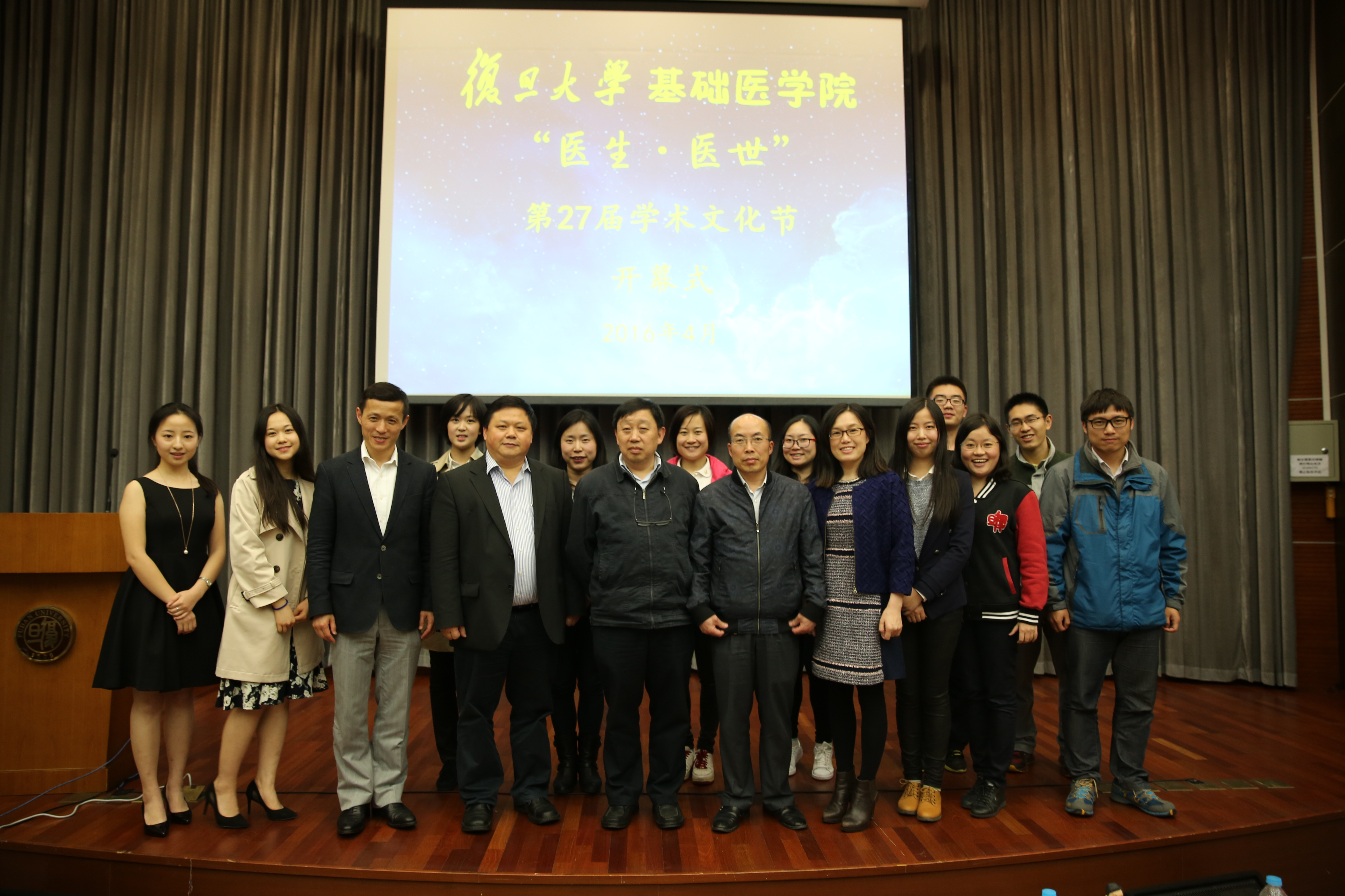 2016年4月26日晚18:30,“医生·医世”复旦大学基础医学院第二十七届学术文化节开幕式在江湾校区李兆基图书馆报告厅隆重举行。此次开幕式采用同学提名投票的形式选取了四位人气嘉宾,分别是复旦大学附属华山医院神经外科主任医师吴劲松,复旦大学基础医学院病理学系主任朱虹光,2014级临床医学(八年制)1班、临床医学(六年制,MBBS)辅导员宁流芳和复旦大学附属妇产科医院院长徐丛剑,四位嘉宾采用TED演讲的方式分享他们在临床和教育中的经历和体会。出席此次开幕式的还有基础医学院党委副书记韩秀引,基础医学院学工组长陈文婷,基础医学院分团委书记刘佳琦以及各班辅导员。