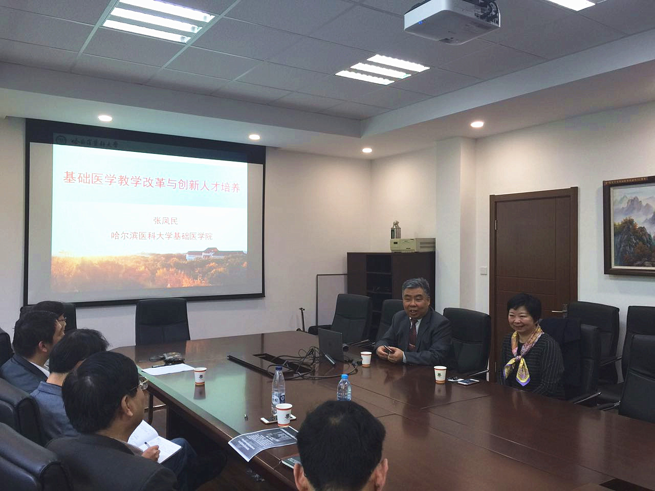 张凤民院长向在座老师首先简要介绍了哈尔滨医科大学的发展历史,随后着重介绍了哈医大基础医学院这些年在基础医学专业建设、创新人才培养、整合式课程体系建设等方面所做的努力和取得的成果。我院教师也就基础医学发展和教育教学改革方面的焦点问题与张院长展开了深入讨论。报告会在热烈的气氛中进入尾声,大家表示,应多多开展这样开放的同行交流,以便更好地发展基础医学,做好专业建设。