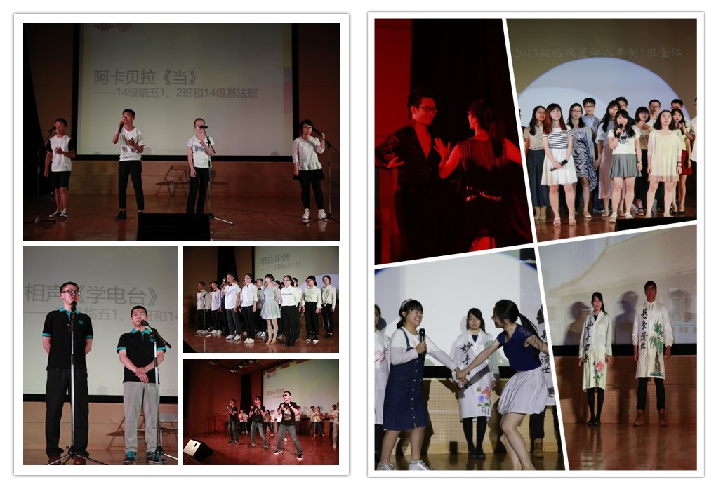 接下去是由2014级临五1、2班和2014级基法班的同学们为我们带来的多声部人声合唱《当》和相声《学电台》,以及分别由2015级临五1班、2015级临八2班和2014级临八2班带来的歌曲串烧《LIFE》、乐器合奏《克罗地亚的送别》和拉丁舞串烧《summertime》。医学生用多样的表演形式和丰富的演出内容,展示了我们多彩的生活。人声合唱为我们带来了听觉盛宴;而相声表演让我们感受到医学生们严谨之外的幽默;“送别”的柔情依依搭配“克罗地亚”的激昂高亢,电钢琴搭配小提琴,悠扬的琴音绕梁不绝;无论是深情的伦巴,轻快的恰恰,还是狂野的牛仔,都充分展现了医学生们的活力;更值得一提的是,2015级临五1班几乎全员参与表演,体现了他们的集体意识和极大的参与热情。
