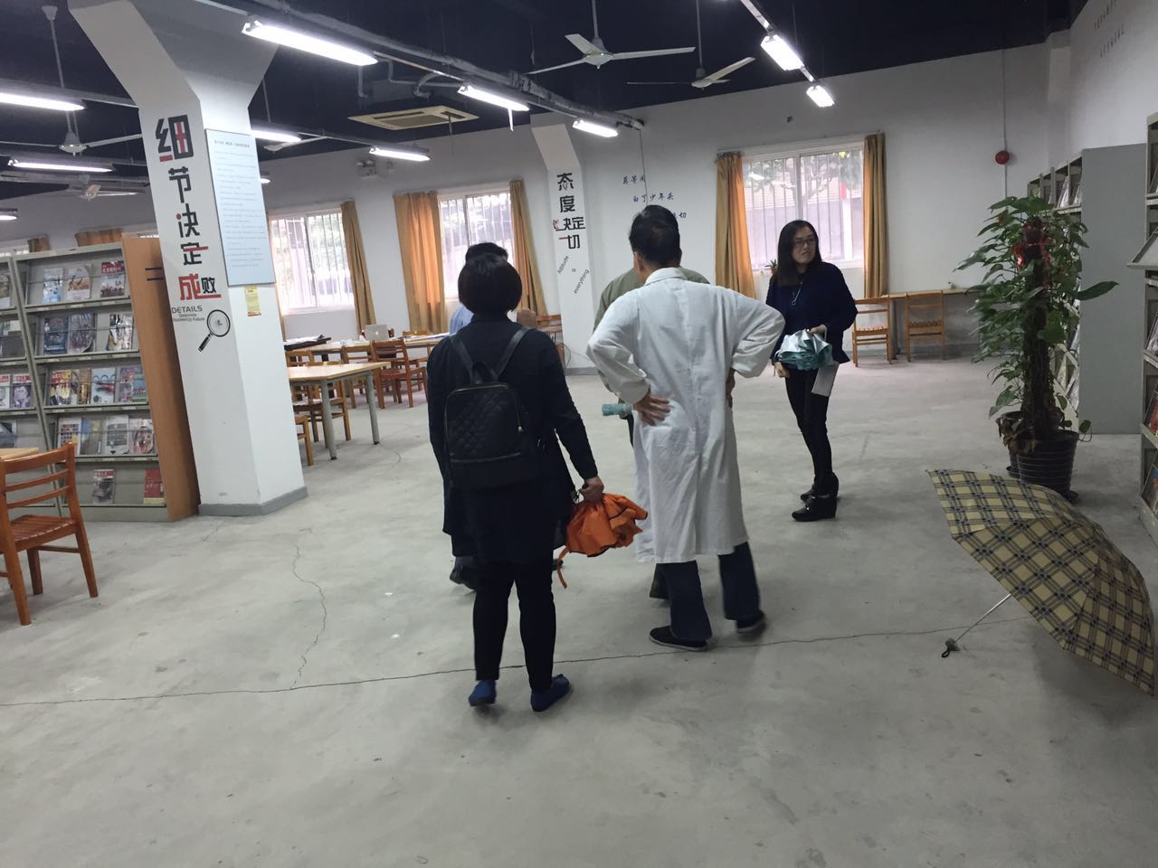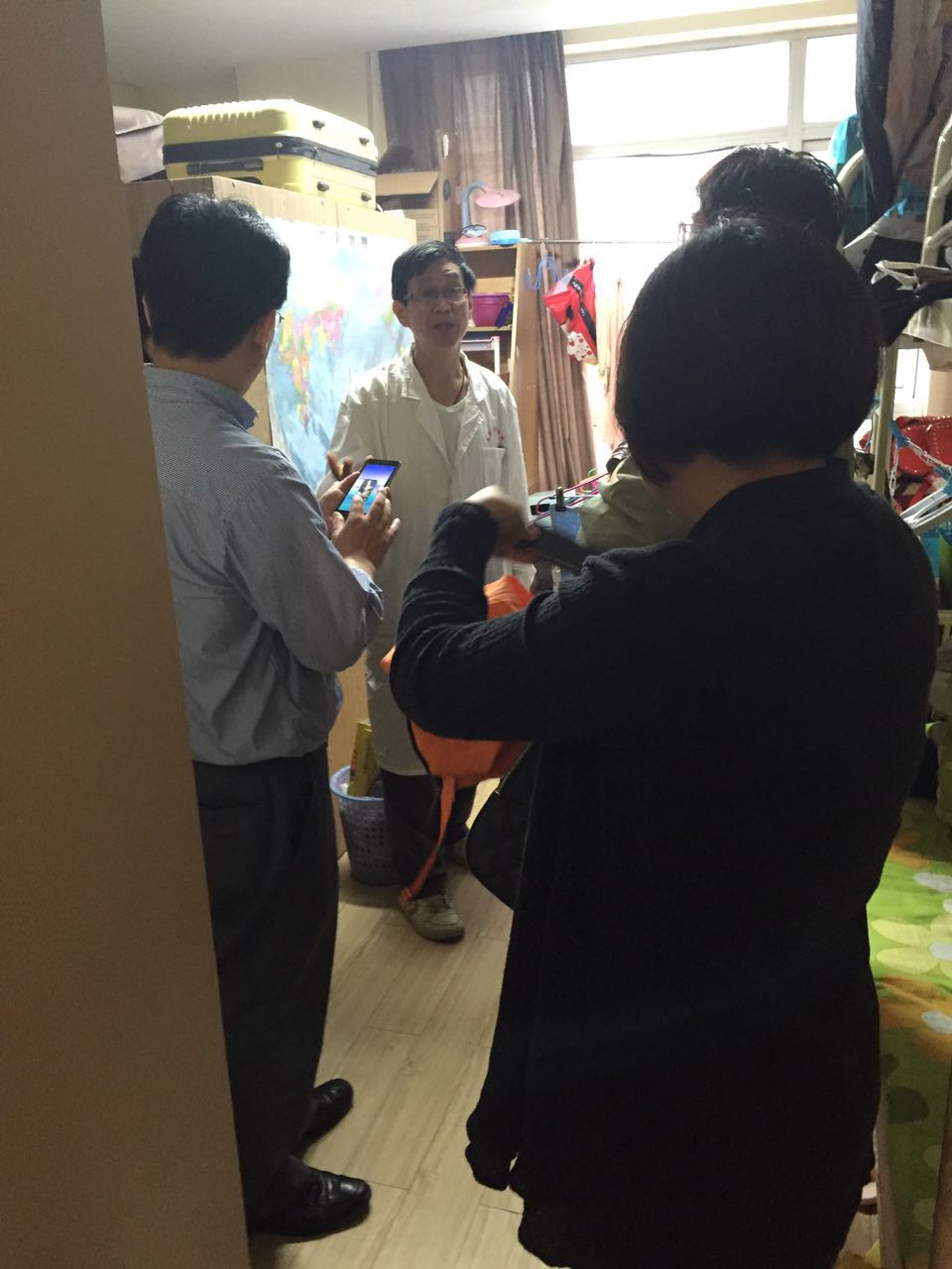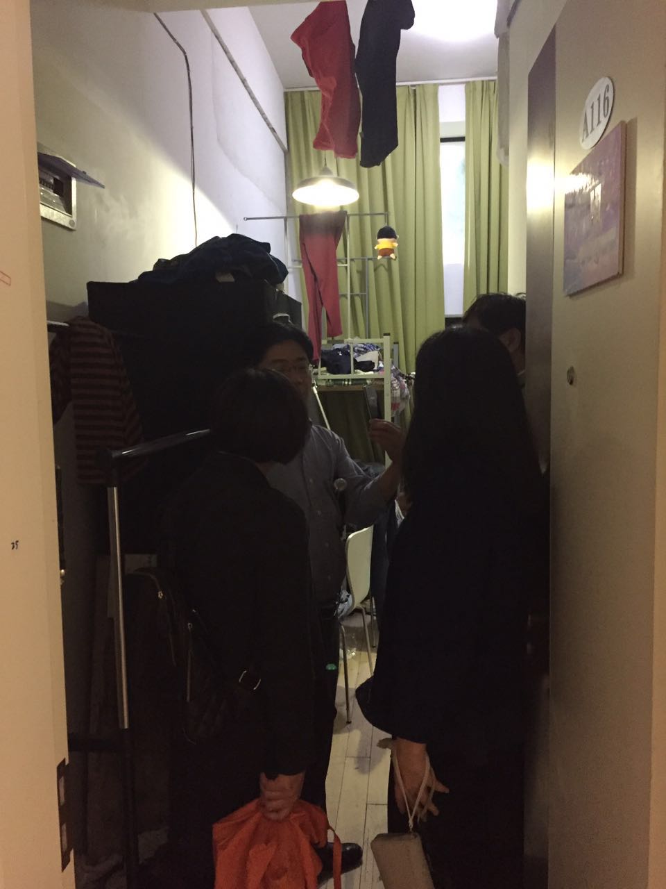 在基础医学院党委副书记韩秀引和研工组张镭的陪同下,三位导师代表首先来到了漕宝路寝室。在西苑管理范老师的陪同下,先后看了住宿点的各个公共设施,包括食堂,晾衣间,自习室等。随后到各个楼层查看学生宿舍的情况。在走访中,导师们也就顶楼漏雨的问题再次和园区的管理老师进行沟通,希望能尽快完成修缮。之后导师们又来到菁英汇住宿点。相较于漕宝路住宿点,菁英汇住宿点的空间更为狭小。