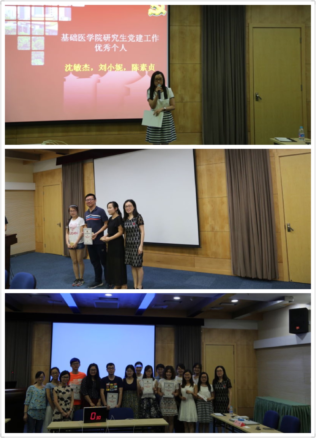 随后进行了2015年至2016年度基础医学院研究生党建表彰活动,王用利、林俊逸、杨玉芳获得基础医学院优秀研究生党小组长;人体解剖与组织胚胎学系党小组、法医学系党小组获得基础医学院优秀研究生党小组;沈敏杰、刘小妮、陈素贞获得基础医学院研究生党建工作优秀个人;胡琅玥、李冰骥、陶萍等六名党员获得基础医学院优秀研究生党员。他们为基础医学院研究生党建水平的提高贡献了自己的力量,相信他们在未来的工作岗位上也一样踏实优秀。