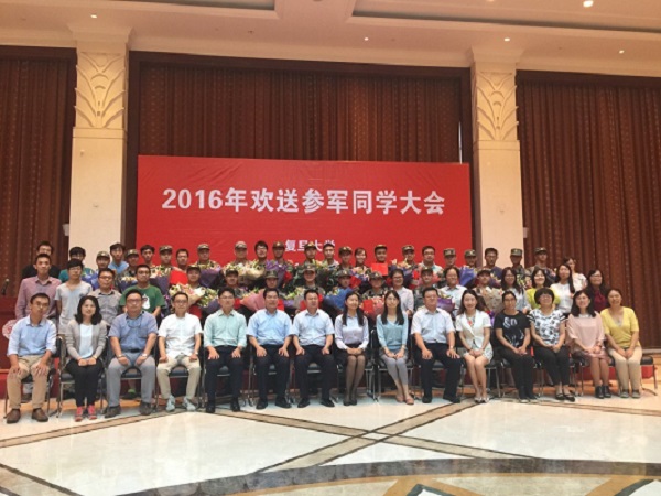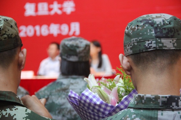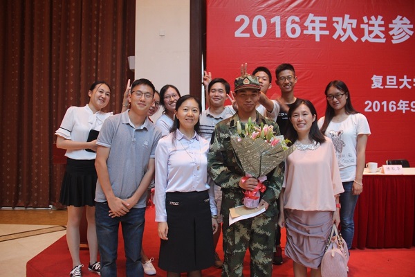 2016年9月19日下午,复旦大学光华楼的多功能厅,在声声嘹亮的军歌旋律中,举行了参军同学欢送会。