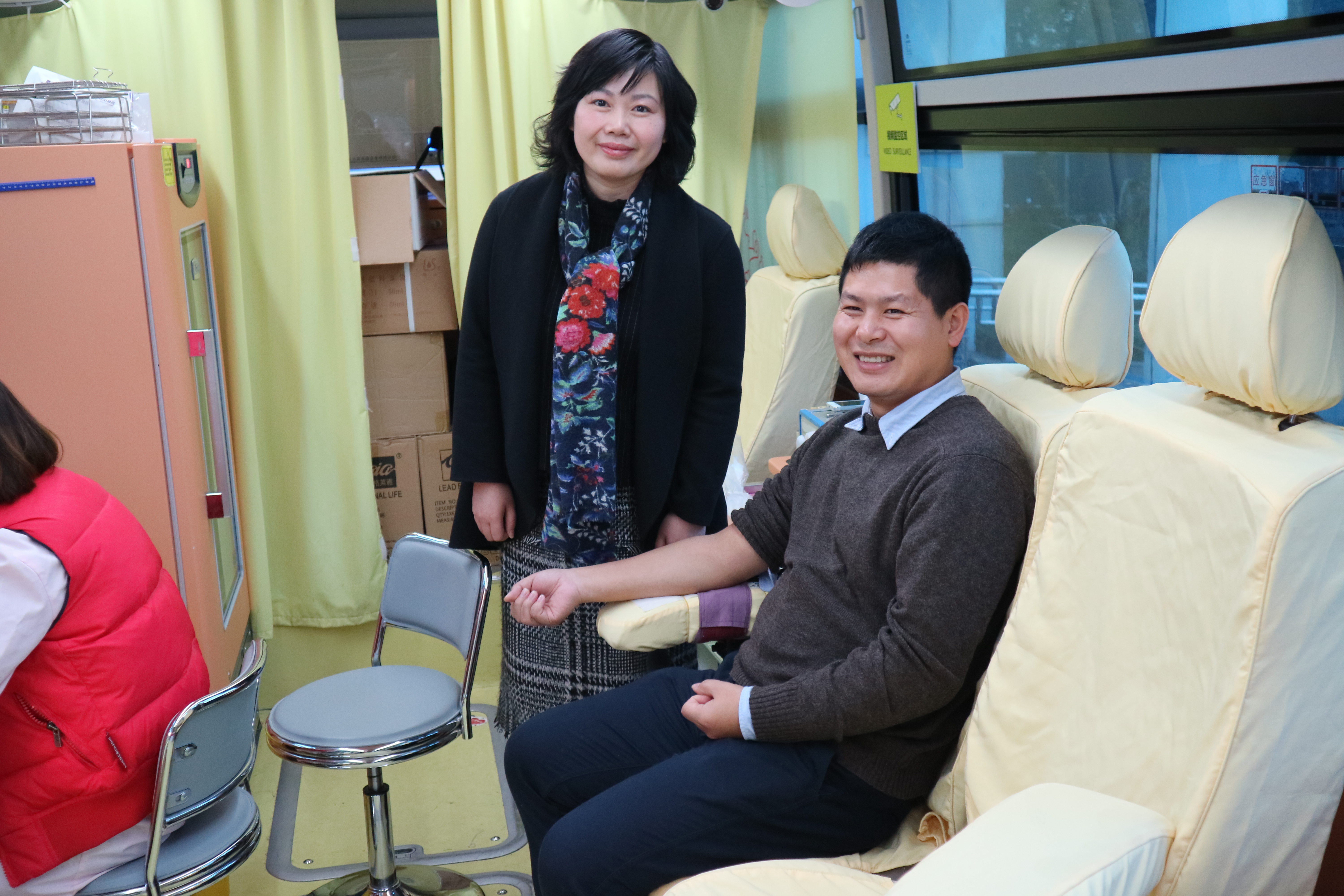 在填表、体检工作完成后,三位老师陆续登上献血车,一袋袋热血载着老师们爱心,即将为病痛中的人们带去温暖与健康。学院党委书记钱海红、副书记徐韶瑛副现场慰问,关心献血老师的身体和献血后反应,提醒大家注意休息、注意饮食,调养身体,还为献血老师准备了红枣、桂圆等慰问品。多名系室主任、工会小组长也陪同前来,现场气氛温馨轻松。