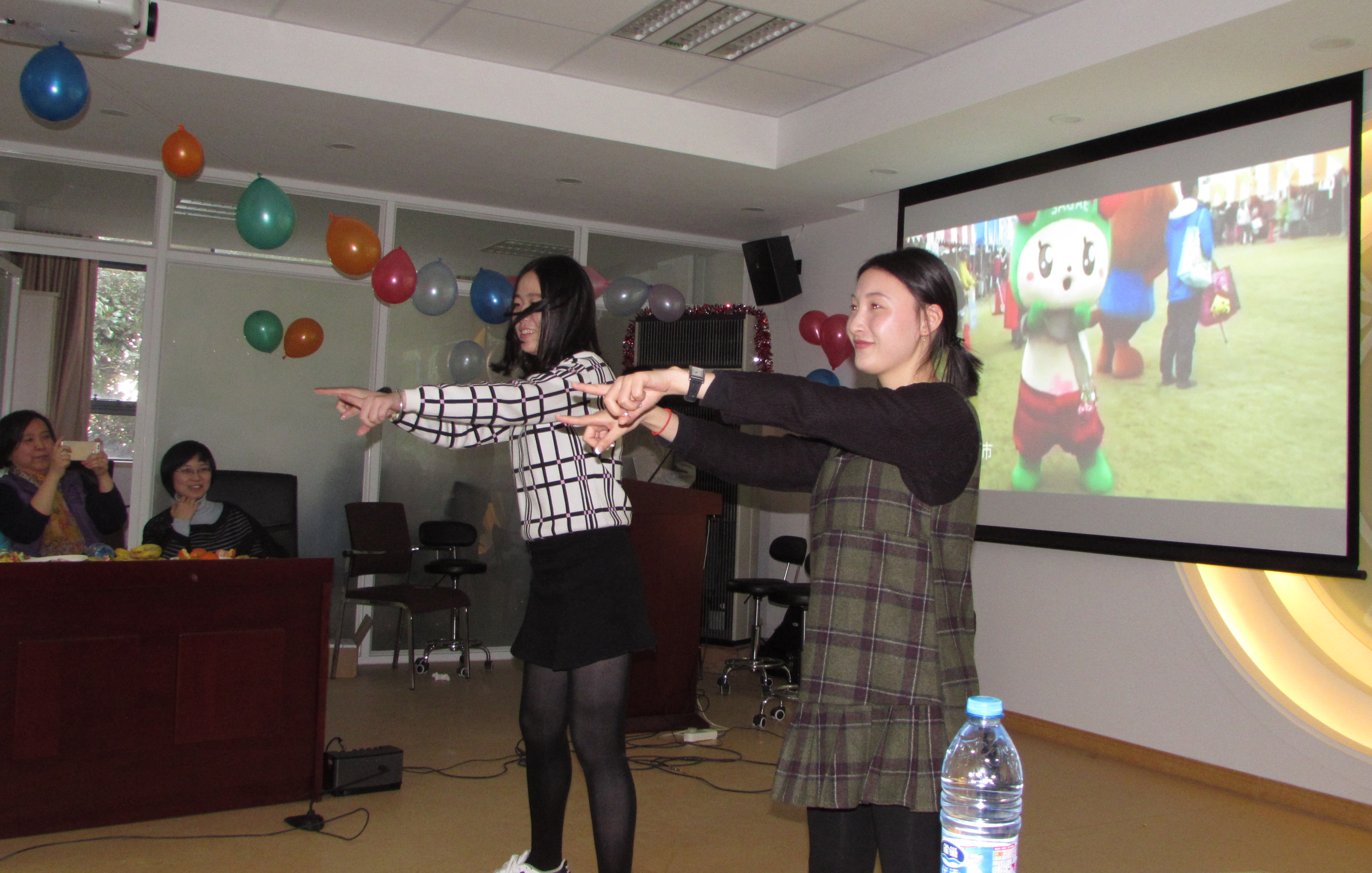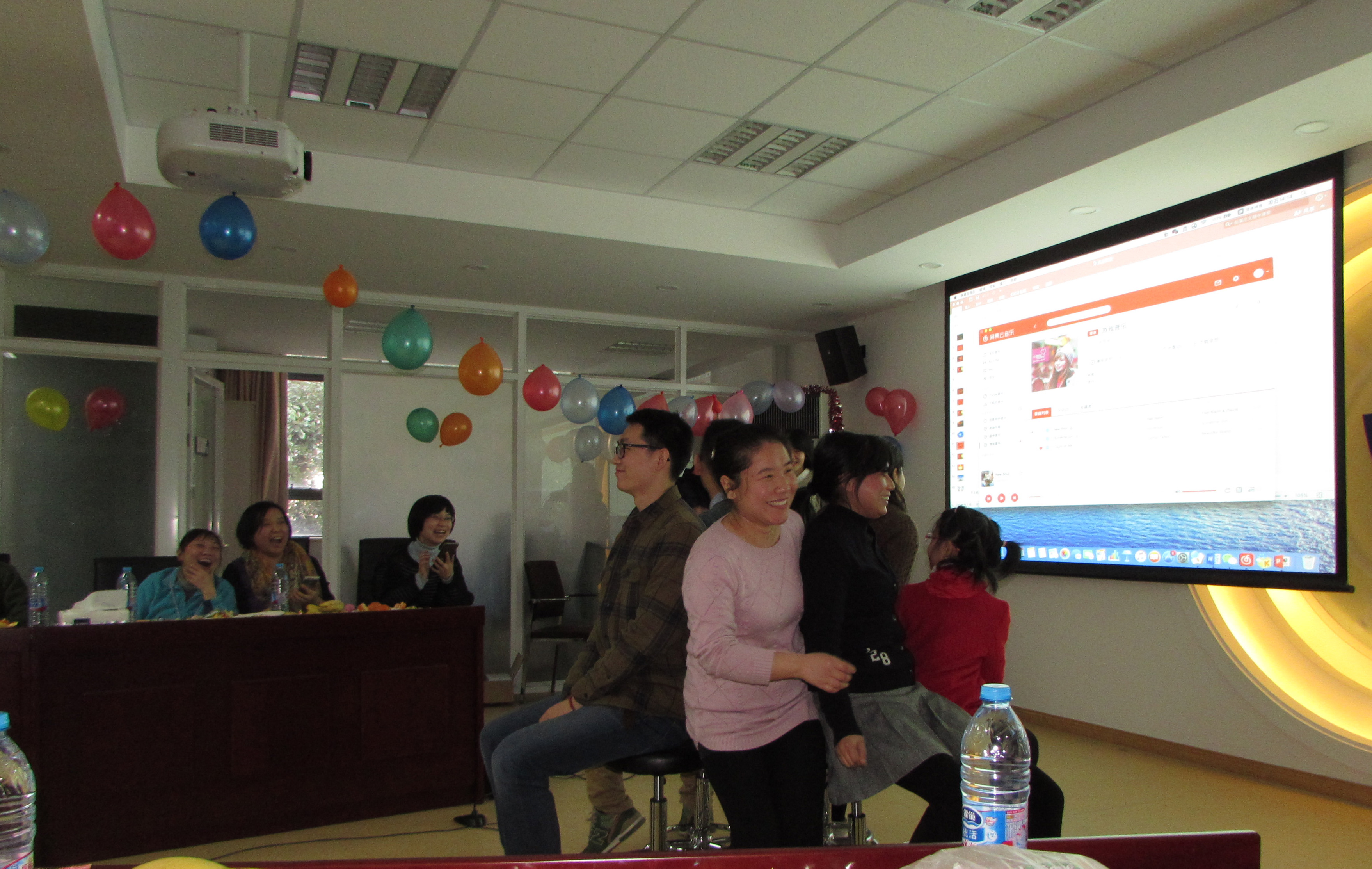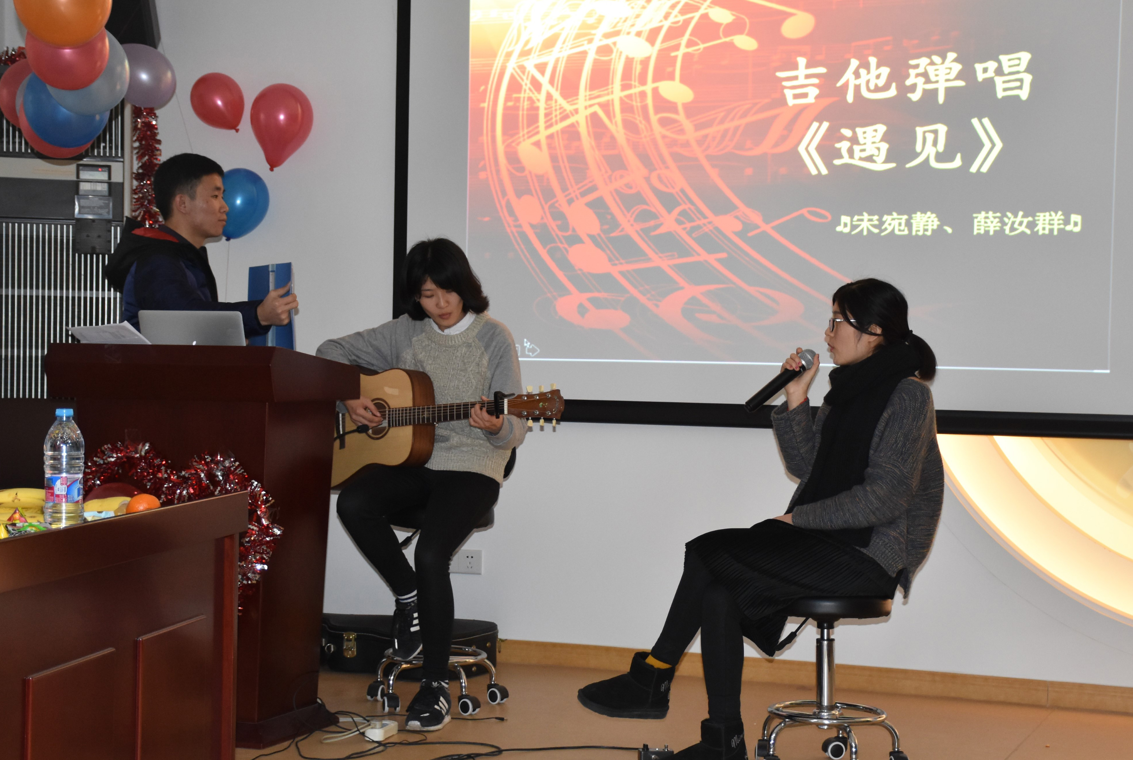 享受完美食,师生共同联欢——文艺表演和游戏。朱虹光、张志刚、刘秀萍老师新年寄语后,热闹多彩的游戏和才艺表演正式开始。首先登场的是《击鼓传花》游戏,瞬间带动现场气氛。游戏期间,朱虹光、曾文姣老师为大家献上动听歌声。各年级研究生节目精彩纷呈:苏莹、徐晨悦带来甜美歌曲《有点甜》,宋宛静、薛汝群的献上优美吉他弹唱《遇见》,忽源、李雪的动感青春舞蹈《恋舞》等,充分展示了同学们才艺。《你比划,我来猜》、《抢凳子》等游戏环节,师生互动,高潮迭起,笑声不断,掌声连连。最后联欢会在后波、任珂汉、方一力三位博士生优美的吉他弹唱声中圆满结束。