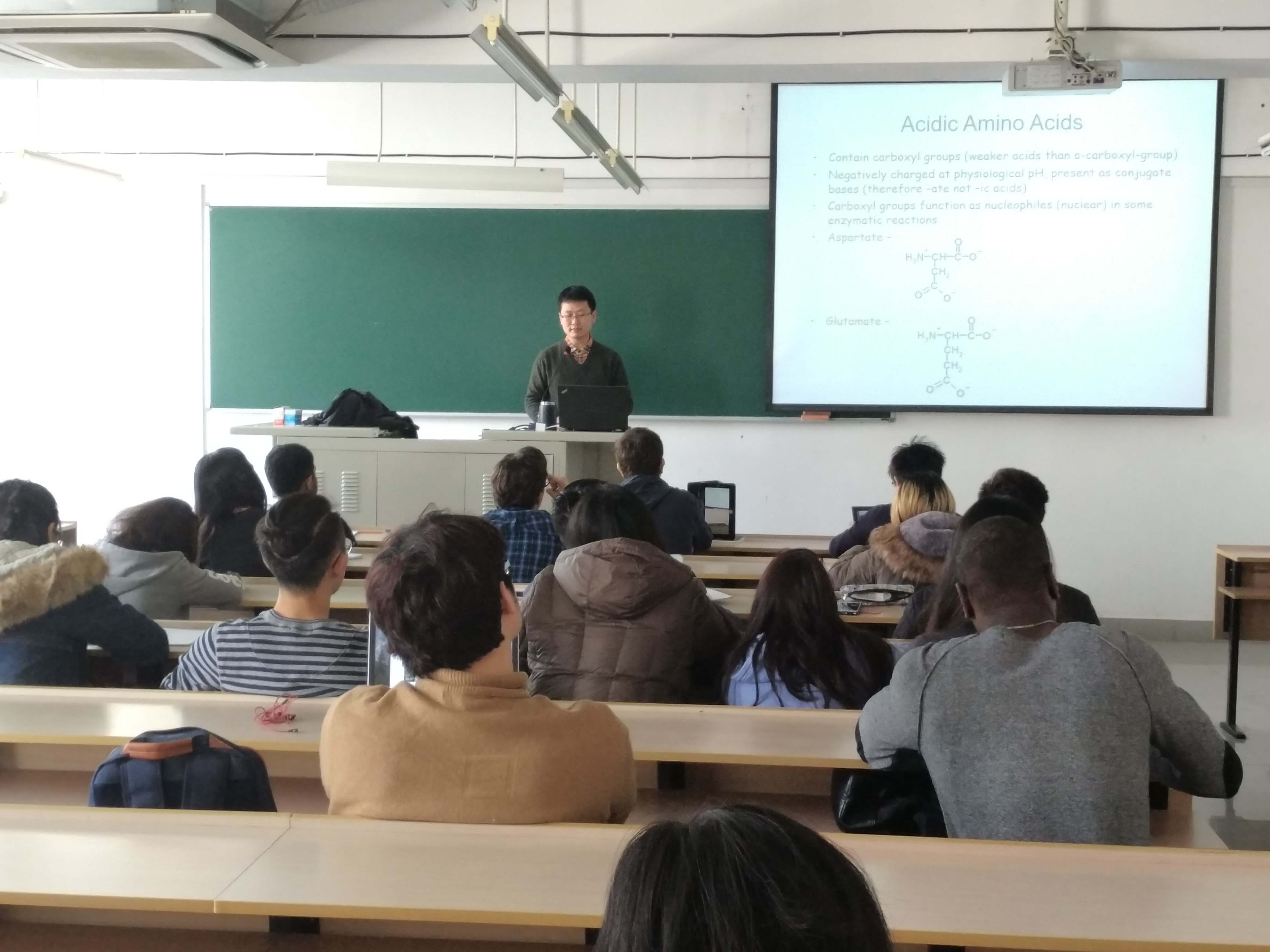 开学第一天,基础医学院部分党政领导前往枫林、江湾校区随堂听课。在枫林校区,党委书记钱海红走进F2601教室,认真听讲生物化学与分子生物学系王旭副教授的《生物化学》(Biochemics),这门课程是学院为15级MBBS临床医学六年制留学生开设的全英文课程。课堂上,王旭老师讲解思路清楚,英语口语流利,课堂气氛活跃,课间探讨充分。在江湾校区,《病理解剖学》《生理学》《分子生物学原理》《免疫学》等课程都在有序进行,张志刚、严大鹏、何睿、王继江等教授作为主讲教师,提前就到教室中进行准备,并询问同学们在假期中的见闻与收获。学生们都精神饱满,对新学期充满期待。