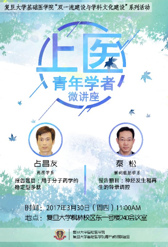 2017年3月30日,第五期上医青年学者微讲座在东1号楼2楼多功能厅举行,我院20余位中青年教师参加了本次活动。本次微讲座主讲人为人体解剖与组织胚胎学系青年研究员秦松和药理学系青年教师占昌友老师。两位老师的交流题目分别为《神经发生和再生的转录调控》和《用于分子药学的稳定型多肽》。
