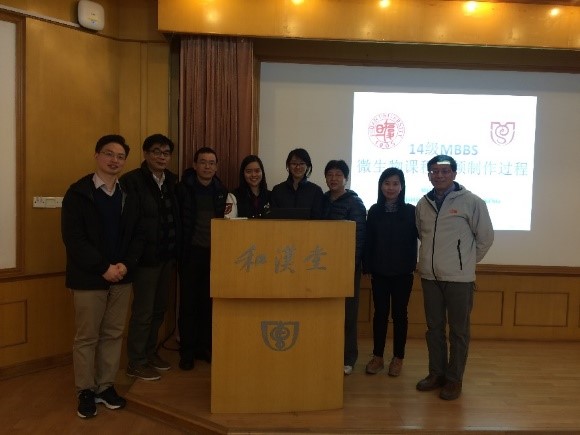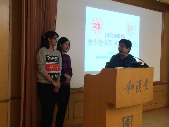 为响应国家教育信息化战略部署,深化复旦大学医学混合式课程教学改革,推进基础医学院主干课程建设中微课视频的制作,复旦大学病原生物学系特邀请14级MBBS班级的林爱丽和汤家嫣两位同学,于2017年3月27日在治道楼和汉堂举行了一场别开生面的微课视频制作培训会。