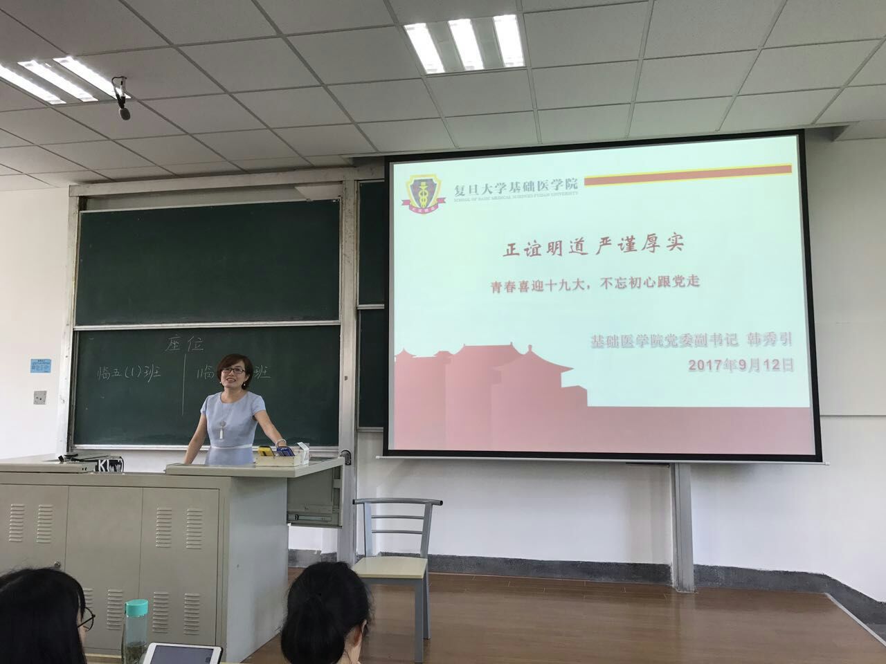 讲座由基础医学院党委副书记韩秀引老师主讲,韩书记从上医的创校源头讲起,为新生们讲述了属于上医人的历史传承。上医校训“正谊明道、严谨厚实”影响了一代又一代的上医人。90年来,上海医学院多次更改其名,却将属于上医人的精神一直传承了下来,培养出了许许多多的优秀人才,并始终以人文情怀、领袖素质、国际视野、科研素质作为人才培养的主要目标,90年来培养出了50位院士,为中国的医学事业做出了重要贡献。