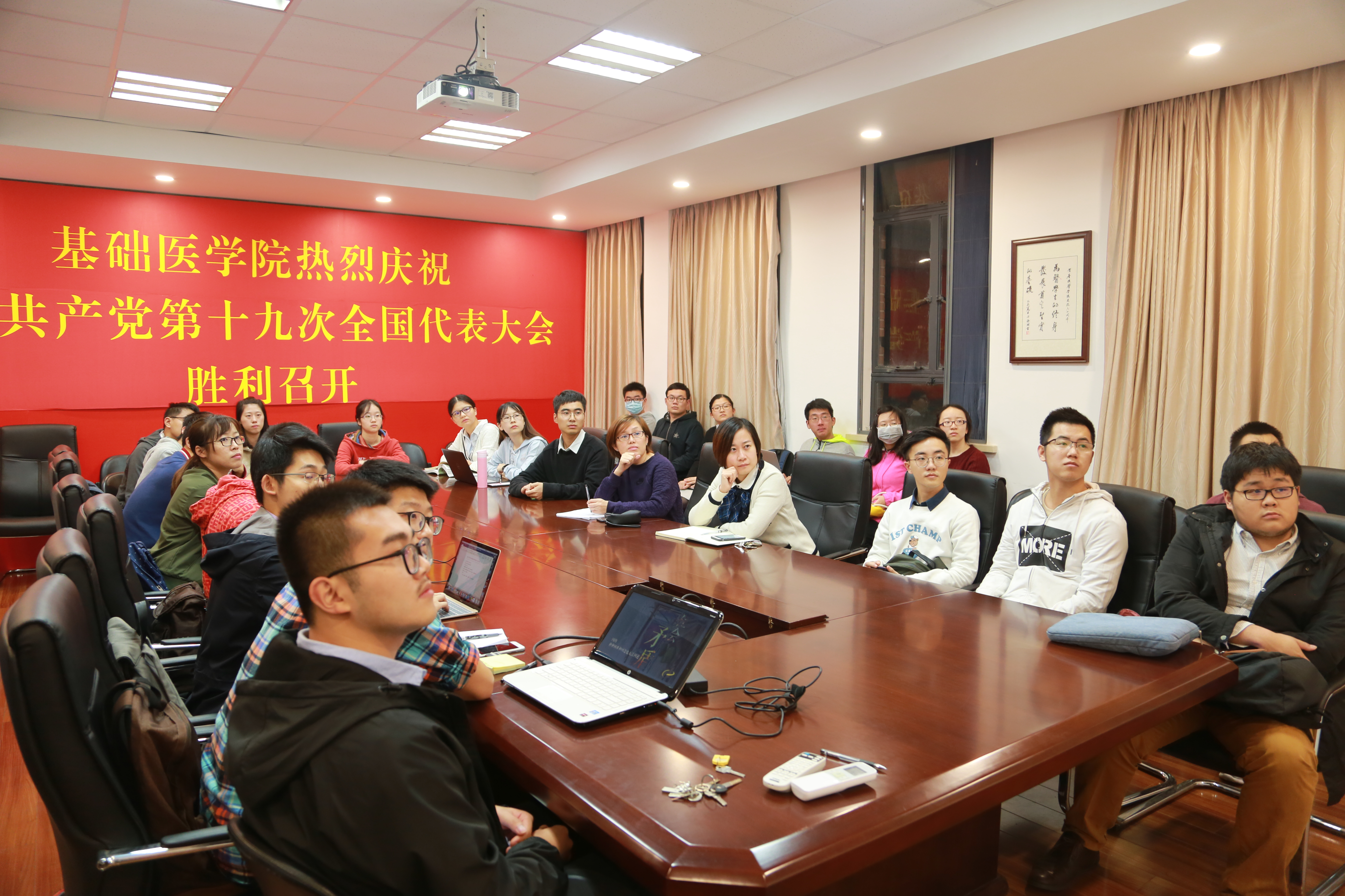 2017年10月28日晚,基础医学院学生党总支组织召开预备党员专题座谈会,学生第一、第二党支部的预备党员们齐聚一堂,并邀请中山医院学生党支部预备党员们一起,共同学习党的十九大报告,深入领会和贯彻十九大精神。基础医学院党委副书记韩秀引老师出席座谈会并作总结发言,学工组刘佳琦、曲正祥老师参加座谈会。座谈会由基础医学院学生第一党支部预备党员陈一凡同学主持。