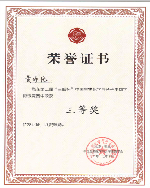 复旦大学基础医学院生物化学与分子生物学系黄海艳老师参加了本次微课公开赛,参赛的内容是“生物氧化过程中,ATP 合酶的作用”,黄老师精心准备了本次微课大奖赛,课件制作图文并茂,并加入的动画效应;在比赛中黄老师发挥了水平,她用形象,生动的教学手段娴熟地处理了教学中的难点。荣获了三等奖。
