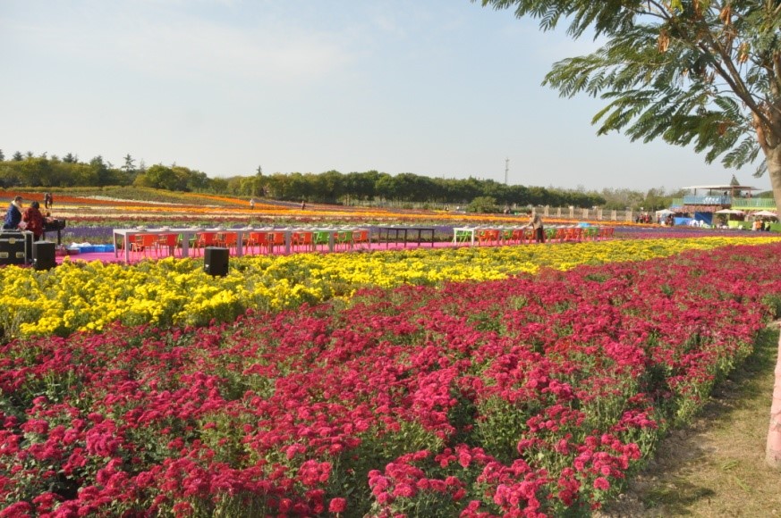 在户外,旷广的田野里盛开着各类菊花,朵朵婀娜多姿。它们名品相压,争妍斗奇、花团锦簇、姹紫嫣红。花儿在和风中摇曳,幽香弥漫,花香袭人;远处眺望仿佛五彩的地毯相互簇拥,与蓝天、白云交映成辉,形成一美轮美奂的风景画。