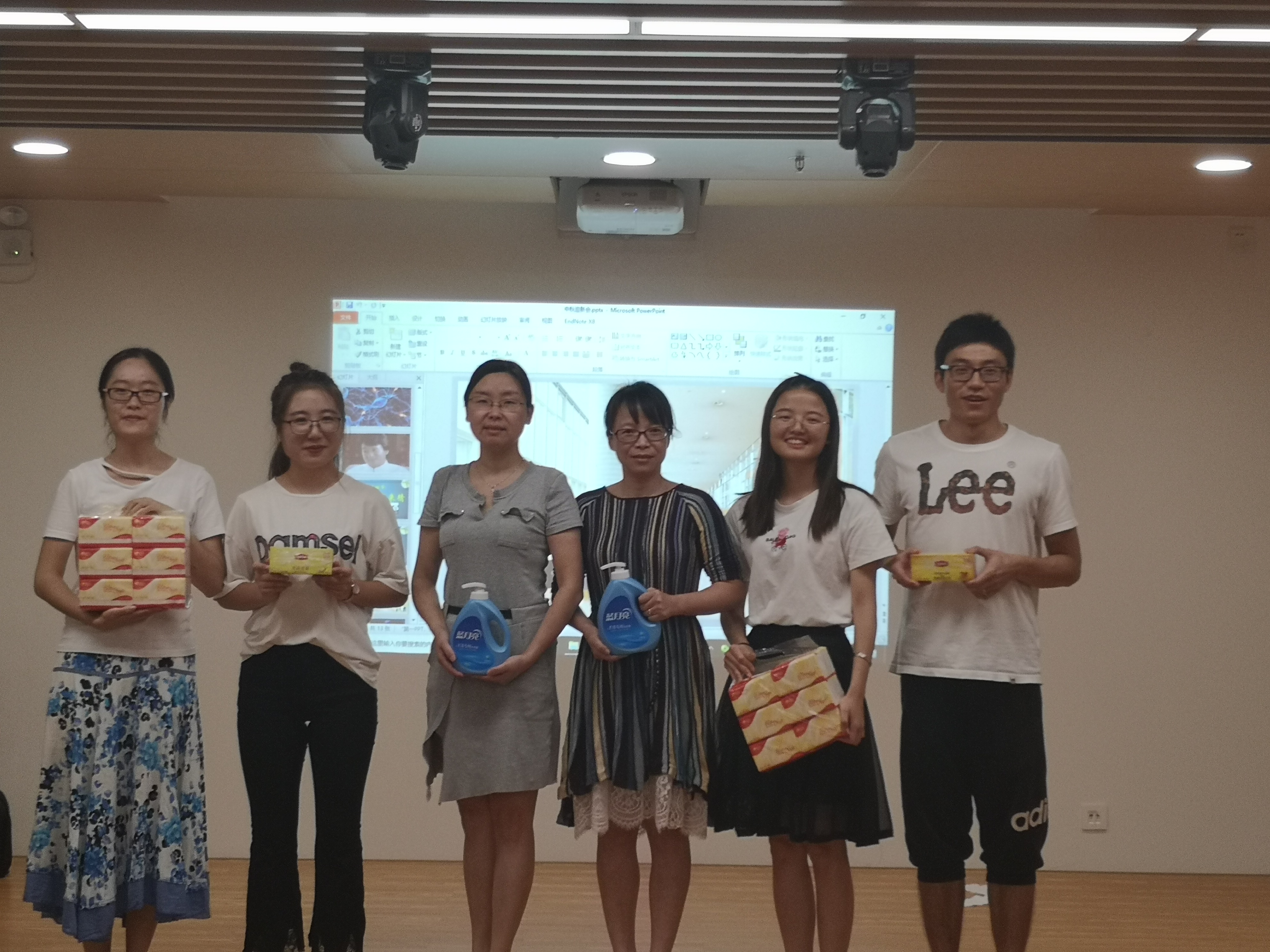 本次活动由可爱的王钰同学和帅气的李浩源师兄主持。全体老师的集体走秀拉开节目的序幕,其最后千手观音的定格造型和“学贯中西 和谐进取”彩蛋,引来同学们的阵阵掌声。舞起乐鸣,陈藤、申时雨、王雨萌、李茜和马雪五位新同学带来了活泼可爱的《海草舞》。高年级研究生童小雨、朱健瑜、杨维等几位师姐带来了杨维同学原创的情景剧《神经工作细胞》,科学有趣,新颖别致。接下来新同学申时雨表演了脱口秀《今天你脱发了吗》,调侃了科研的艰辛,赢得了大家的深深共鸣。在节目的中间穿插了游戏环节,新生组、老生组和老师组分别派代表参与了你划我猜的游戏,其中老师组的汪军和俞瑾老师配合默契,拔得头筹。