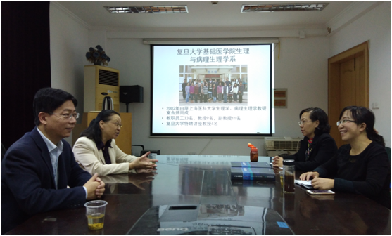 2018年10月25日上午,生理与病理生理学系副主任陆利民教授,党支部书记沈霖霖教授热情接待了大理大学基础医学院的同行。陆利民向嘉宾们详细介绍了复旦大学基础医学院生理与病理生理学系的概况和历史,以及本科生教学情况、课程建设情况、教学改革的思考和推进情况,主要的科研方向、研究生招生和培养情况等。大理医学院的来访教师对生理学教学中考核评价方式的改革、课程形成性评价推进、慕课、微课建设等教学改革产生了浓厚的兴趣,并向我院教师介绍了大理大学基础医学院生理与病理生理学系教学和科研情况。生理学教学秘书刘俊参与了座谈交流。
