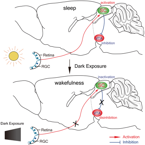 现代社会国际交流日益频繁,跨时区工作、旅行非常普遍,倒班、加班的工作节奏也成常态,由异常光照造成的生物节律紊乱和睡眠障碍等相关疾病的发病率逐年攀升,严重影响人们的工作与生活。黄志力课题组发现,视网膜神经节细胞-上丘γ-氨基丁酸能神经元-腹侧被盖区多巴胺能神经元神经通路介导了急性黑暗暴露诱发小鼠觉醒效应,为临床治疗异常光照引起睡眠紊乱相关疾病提供了新思路。该研究成果于2019年1月31日,以《上丘γ-氨基丁酸能神经元在黑暗暴露诱发小鼠觉醒效应中起到关键作用》(“Superior Colliculus GABAergic Neurons Are Essential for Acute Dark-Induction of Wakefulness in Mice”) 为题,在线发表于国际权威期刊《当代生物学》(Current Biology)。