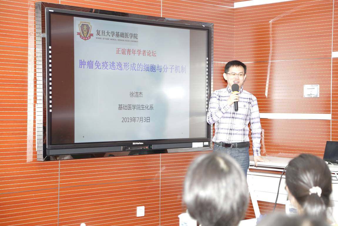 7月3日中午,基础医学院第二期“正谊青年学者论坛”在复星楼一楼报告厅举行。复旦大学附属肿瘤医院乳腺外科余科达教授和基础医学院生物化学与分子生物学系徐洁杰教授作为论坛特邀嘉宾,分别作了题为“三阴性乳腺癌分子内涵与靶点探索”和“肿瘤免疫逃逸形成的细胞和分子机制”的专题学术报告。此次论坛由基础医学院孟丹教授主持,各院系和附属医院不同专业的百余名师生前来聆听学习,座无虚席。