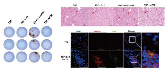基于G12抗体能快速、有效清除乙肝表面抗体,研究团队进一步研究了“三明治疗法”在腺相关病毒(AAV/HBV1.2)感染建立的慢乙肝小鼠模型中的治疗效果。首先给予抗病毒药物替诺福韦酯(TDF)用药(并贯彻全程),5天后将G12抗体注射入小鼠,形成血清表面抗原和病毒DNA水平均较低的“窗口期”,再通过腹腔注射乙肝治疗性疫苗(mYIC)以激活宿主的主动免疫应答。三次G12抗体和mYIC疫苗的治疗,不仅非常有效地降低了慢乙肝小鼠模型血清和肝脏中的乙肝病毒抗原表达,更重要的是还激活了小鼠骨髓中主动产生抗乙肝表面抗原抗体的体液免疫应答。此外,在对治疗后的小鼠免疫病理研究中还发现,“三明治疗法”有效地激活慢乙肝小鼠肝脏原位的抗病毒细胞免疫应答。