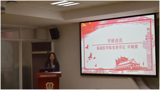 随后,基础医学院党委书记许晓茵为全体学员做开班动员。在讲话中许书记指出,要加入党组织,首先要对党有所了解。许书记向同学们讲述了自己入党时的经历、感受以及自己对党的先进理论的热爱和敬仰。许书记强调了党的理论学习的重要性,殷切希望同学们认真学习党的理论。对党的理论不断学习和理解的过程,更有利于帮助学员进一步端正入党动机,进而逐步形成坚定的理想信念。许书记强调,大学是集中培养人才,创新知识和承担社会服务责任为一体的单位。同学们作为新时代的复旦人,应当从小处做起,立鲲鹏之志,要做就做为天下人谋永福的大丈夫、大姐姐。