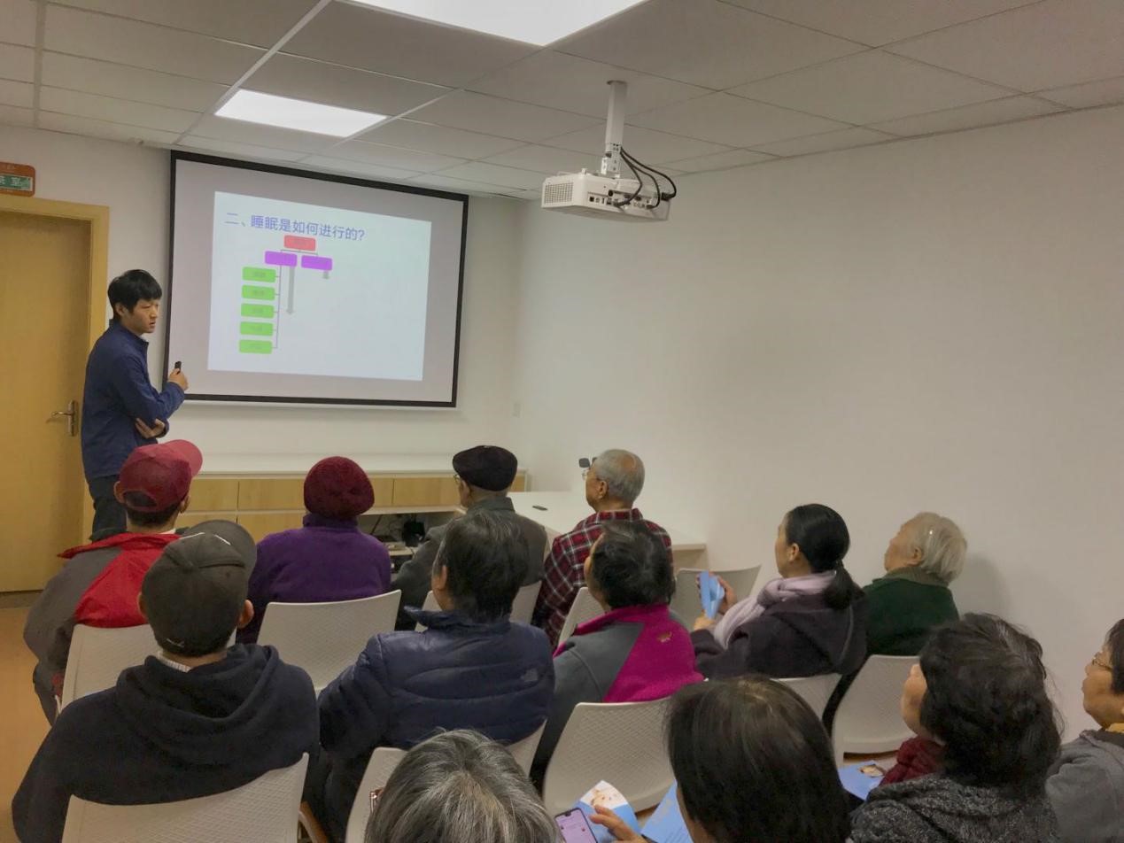 人生的三分之一是在睡眠中度过的,为了增强广大群众的健康睡眠意识,改善老年人睡眠质量,支部党员制作了精美实用的睡眠小知识宣传手册,活动开始前分发给社区居民。入党积极分子孙霄作了一场主题为“天天都有好睡眠”的科普讲座,从睡眠的作用、睡眠是如何进行的,以及如何保证良好睡眠这三个方面为小区的居民们带来了一场深入浅出、贴切实际的科普讲座。
