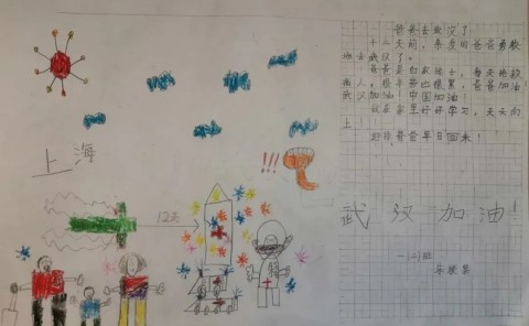 这段暖心的祝福来自一位名叫朱顾黎的一年级男孩,他的妈妈是基础医学院药理研究中心的刘星副教授,而他的爸爸朱磊是复旦大学附属华山医院的普外科主治医师。2020年2月9日,朱磊医生成为了复旦大学附属华山医院第四纵队的一员,义无反顾地踏上远赴武汉支援抗疫的路途,主战场便是武汉同济医院光谷院区的重症监护室。在这段祝福旁,还有一幅一家三口其乐融融的全家福,这是男孩对爸爸的思念和对团聚的渴望,也是男孩对爸爸舍小家、为大家精神的支持与敬佩的表现。