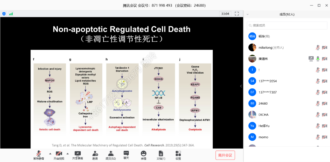 讲座中,唐道林教授详细讲述了Ferroptosis作为一种自噬依赖性细胞死亡类型的调控机制,该过程由铁依赖性脂质过氧化作用驱动。唐教授讲解了“铁死亡”的机制及研究进展,分析了“铁死亡”在多类疾病中的调控作用,使听众对该领域有了更深刻的了解。