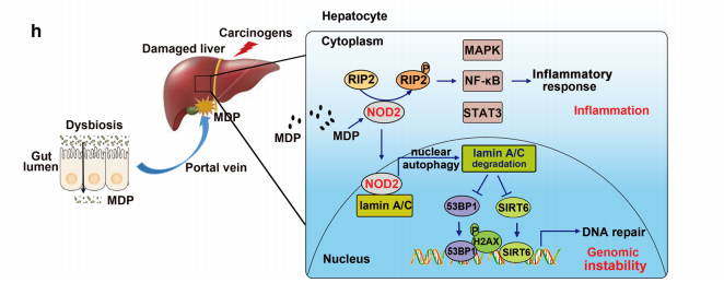 肝脏发生损伤时可引起肠道菌群失调和肠道渗透性增加,肠源性细菌成分通过门静脉系统到达肝脏增多而清除减少,逐渐累积的细菌成分可持续促进肝脏疾病发展,形成“二次打击”,但介导病原微生物二次打击的识别受体尚不明确。该项研究发现:细菌成分胞壁酰二肽可通过激活病原微生物识别受体NOD2,活化NF-κB、MAPK和STAT3信号通路,促进炎症因子的释放而加重肝脏炎症反应。更重要的是,该项研究在国际上首次发现:NOD2激活后,能够进入细胞核,引起核自噬。而核自噬降解维持基因组稳定的关键蛋白lamin A/C,从而增加基因组的不稳定性,导致正常细胞死亡转变为肿瘤细胞机率增加,增加致癌性。
