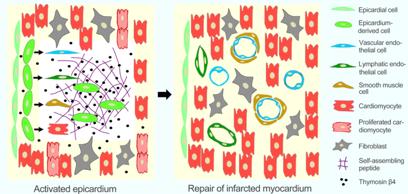 近日,基础医学院人体解剖学与组织胚胎学系谭玉珍教授与王海杰教授课题组在《Theranostics》发表了“Thymosin β4 released from functionalized self-assembling peptide activates epicardium and enhances repair of infarcted myocardium”,提出新型功能化自组装肽缓释Tβ4能够显著促进梗死心肌修复。 论文内容介绍 心肌梗死是心血管疾病的主要死因之一,严重威胁着人们的生命和健康,给家庭和社会带来沉重经济负担。随着现代化治疗手段的不断进展,心肌梗死患者存活明显改善。但是,由于坏死心肌不能修复,梗死后心力衰竭的发病率呈上升趋势。在胚胎时期,心肌发育主要依赖于心外膜细胞分化和心肌细胞增殖。然而,成年心外膜处于静止状态,心肌细胞增殖能力丧失。因此,激活内源性心肌修复能力对于提高心肌梗死的治疗效果具有重要意义。为此,作者通过分子模拟成功设计和合成了一种新型功能化自组装肽,该自组装肽包括Tβ4结合位点和细胞黏附配体,可缓释Tβ4和促进细胞黏附存活。转基因小鼠遗传谱系追踪发现,自组装肽缓释的Tβ4能够激活心外膜,使心外膜细胞向心肌细胞、血管和淋巴管细胞分化,并激活心肌细胞增殖。移植携带Tβ4的自组装肽后,梗死组织的心肌再生、血管和淋巴管新生显著增强,心功能得到明显改善。本文提出,新型功能化自组装肽缓释Tβ4可作为临床通过激活内源性心肌再生机制促进梗死心肌修复的新策略。 王用利博士为本文的第一作者,谭玉珍教授和王海杰教授为共同通讯作者。中国科学院上海生物化学与细胞生物学研究所周斌研究员提供转基因小鼠,美国斯坦福大学医学院心血管研究所Sean M. Wu教授给予了帮助。