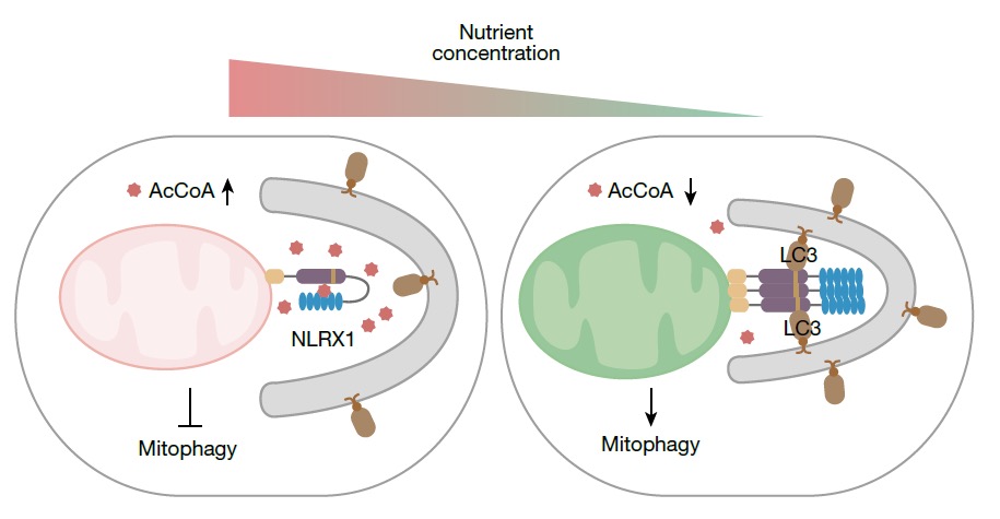 研究人员通过质谱分析,锁定了细胞质乙酰辅酶A代谢途径在其中发挥关键作用。那么,细胞是如何“感知”细胞质乙酰辅酶A浓度的波动,并将这一信号传递给线粒体的呢?研究人员利用全基因组CRISPR/Cas9筛选,在乙酰辅酶A水平下降诱导的线粒体自噬模型中一个名为NLRX1 的蛋白脱颖而出。NLRX1是唯一已知定位于线粒体的NOD样受体,2019年Nature Immunology上发表的一个研究“Listeria hijacks host mitophagy through a novel mitophagy receptor to evade killing”发现其介导细菌感染等情况下线粒体自噬。后续证实NLRX1的缺失在体内外完全阻断由乙酰辅酶A下降所触发的线粒体自噬,但并不会影响一般的细胞自噬。这表明NLRX1是这条新通路中不可或缺的、高度特异的“哨兵”。