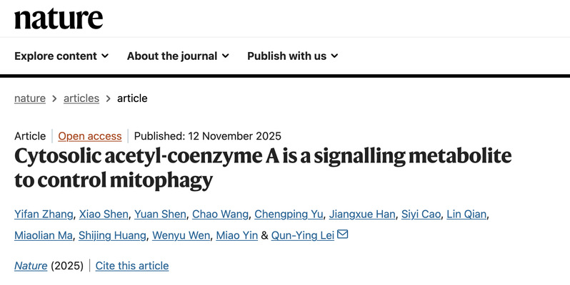 北京时间11月13日零点,复旦大学基础医学院雷群英团队在《自然》(Nature)杂志在线发表了来自题为“Cytosolic Acetyl-Coenzyme A is a signalling metabolite to control mitophagy”的研究论文。