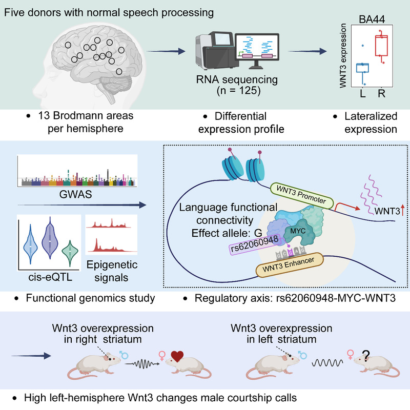 言语功能为何偏爱左脑?研究团队对5名尸脑13个言语相关布罗德曼分区双侧采样,深度剖析125份RNA测序样本,构建首个人类语言相关脑区的半球解析转录组图谱。研究发现大脑侧化呈显著区域特异性。如初级听觉皮层BA41区呈现最显著的转录侧化。功能富集分析发现,半球间差异基因高度汇聚在突触信号传导、神经递质分泌以及轴突髓鞘化等核心过程。为从海量数据中锁定关键因子,团队整合言语、语言及阅读相关性状的GWAS信号,发现非编码区变异rs62060948位于一活跃超级增强子区域内。当该位点为G等位基因时,转录因子MYC能以更高亲和力结合,从而显著增强下游基因WNT3表达。WNT3在右脑BA44区(负责言语韵律加工)的表达显著高于左侧。这种分子水平不对称性,提示其可能参与言语韵律及超音段特征环路构建。