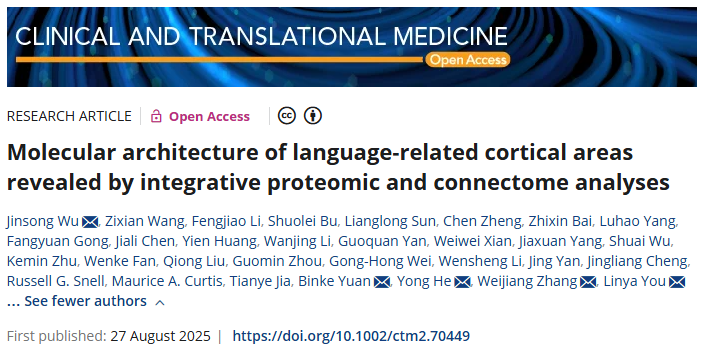 2025年8月,我系尤琳雅副教授团队联合复旦大学附属华山医院神经外科吴劲松教授团队、复旦大学生物医学研究院张炜佳研究员团队、北京师范大学贺永教授团队和华南师范大学原彬科副研究员团队,在转化医学领域顶级期刊《Clinical and Translational Medicine》上发表题为“Molecular architecture of language-related cortical areas revealed by integrative proteomic and connectome analyses”的研究论文。通过系统整合蛋白质组学、脑连接组学及临床神经医学证据,揭示大脑区域间连接强度与其蛋白质表达模式的相似度存在显著关联。研究发现,蛋白质组成相近的脑区间表现出更强的功能同步性,更易形成高效的神经协作网络。尤为重要的是,研究观察到当大脑局部区域因肿瘤等病变导致功能受损时,对侧半球中具有相似蛋白质表达特征的镜像脑区能够被激活并承担功能代偿作用。这一发现从分子层面解释了大脑损伤后功能重塑的内在机制,开创性地从蛋白质组维度阐释脑网络连接与功能代偿的生物学基础,深化了对人脑功能的认识,也为脑卒中、脑肿瘤等疾病的功能康复治疗提供了新的理论依据和干预方向。