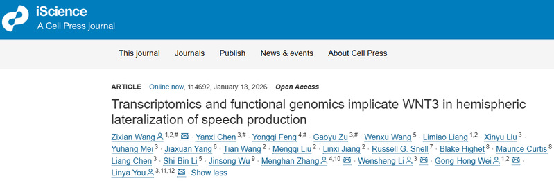 2026年1月,我系尤琳雅副教授团队、生化系卫功宏教授团队、我系李文生教授团队、生命科学院张梦瀚和中国医学科学院/北京协和医学院苏州系统医学研究所王子贤团队于Cell Press细胞出版社期刊iScience上发表题为“Transcriptomics and functional genomics implicate WNT3 in hemispheric lateralization of speech production”的研究论文。该研究整合转录组学、功能基因组学及行为学实验,提示信号蛋白WNT3在言语产生侧化过程中扮演的关键角色,为打破言语基因研究的长期瓶颈提供了新思路。