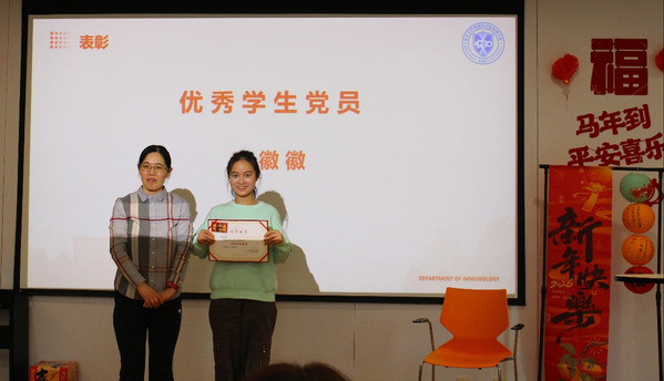 随后,大会对在系室公共事务中热心服务、积极奉献的同学进行了表彰。储以微主任为金哲宇、丁亚伟、李昌顺、欧阳芳、段珍、贾云慧和吴智浩同学颁发热心公益奖荣誉证书,感谢他们的付出。李徽徽同学获评“优秀学生党员”,由党支部书记张伟娟教授为其颁发奖状。系室充分肯定同学们在公益服务和学生党建中的责任与担当,鼓励大家继续发挥示范引领作用。