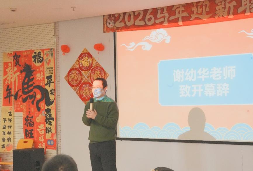 迎新联欢会落下帷幕之际,病原生物学系教工党支部书记赵超向默默付出的幕后工作人员表达了感谢。面向崭新的 2026 马年,他寄语全体师生:“不畏艰辛,大胆往前冲,更要回归本心 ——‘想一下,我是谁’。”也希望病原系的师生们在新的一年里,如骏马般昂扬,以热爱为缰,奔赴更开阔的征程。