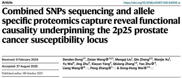 2025年10月8日,复旦大学基础医学院生物化学与分子生物学系卫功宏教授团队在Nature Communications期刊上发表了题为“Combined SNPs sequencing and allele specific proteomics capture reveal functional causality underpinning the 2p25 prostate cancer susceptibility locus”的研究论文。该研究通过整合高通量SNPs-seq技术与等位基因特异性蛋白质组学分析,系统解析了前列腺癌风险位点2p25的功能机制,首次揭示了转录因子USF1通过结合风险等位基因rs4519489-A上调致癌基因NOL10的表达,进而驱动前列腺癌进展的分子通路。