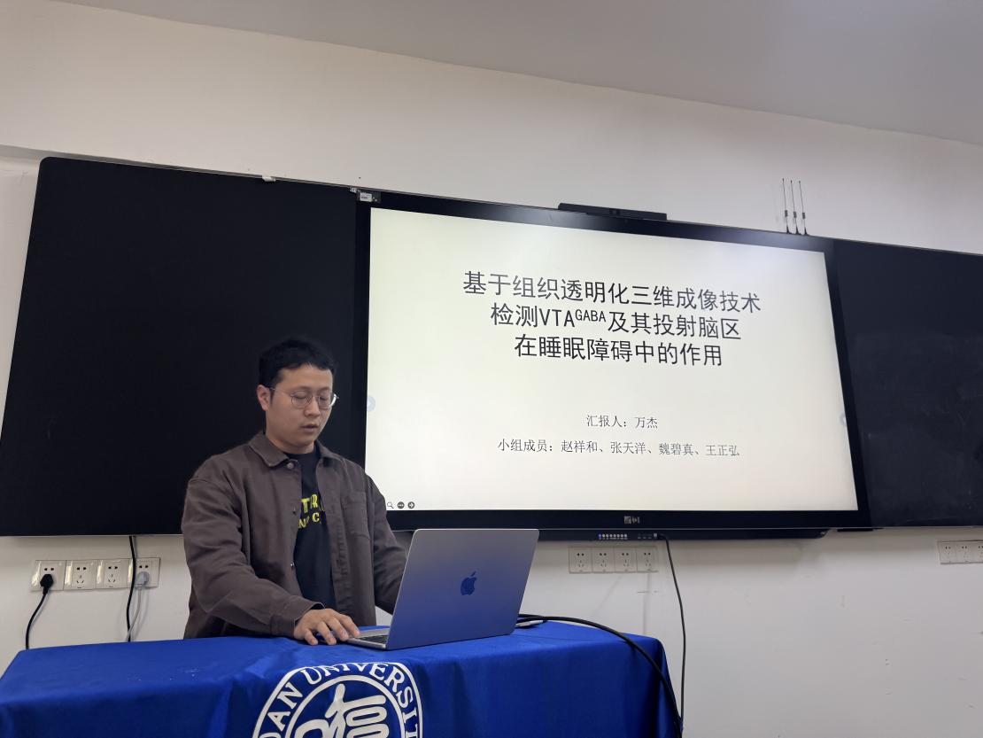 第四组同学的课题探究睡眠觉醒调控的中枢核心。他们以中脑腹侧被盖区(VTA)的GABA能抑制性神经元为起点,利用病毒标记与全脑透明化成像技术,追踪并可视化该群神经元在睡眠剥夺条件下,其向关键睡眠调控脑区的投射网络所发生的动态变化。这项研究为阐明睡眠障碍的环路机制,并寻找潜在的精准干预靶点,做出了意义深远的探索。