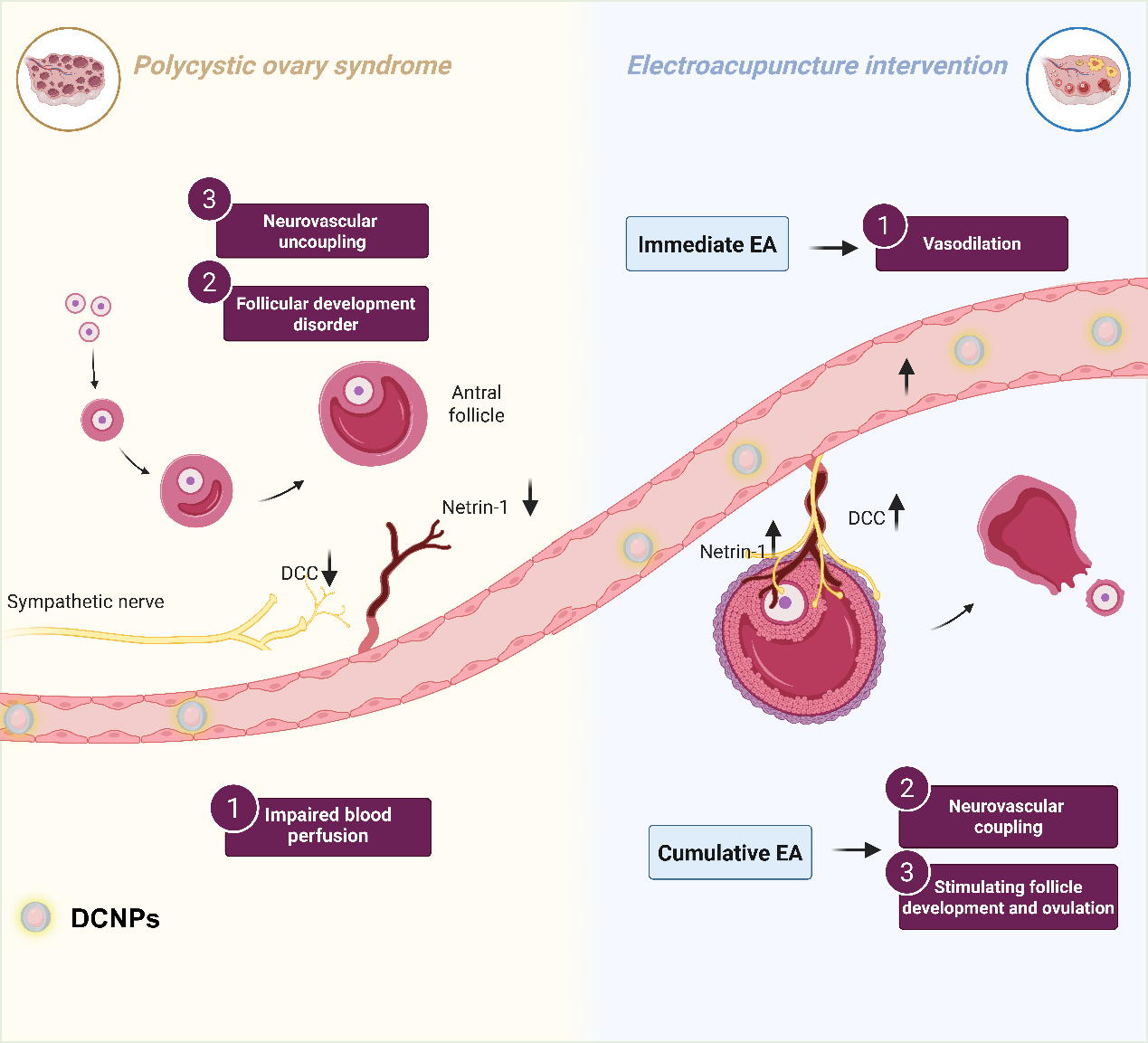 该研究从即时功能调控与长期结构重塑两个时间维度,系统阐明了电针通过神经血管耦合改善卵巢微环境的剂量依赖性机制。依托稳定高清的血管-卵泡特异性成像探针,研究首次实现了对深部卵巢血管结构与灌注动力学的高分辨率、可视化的实时观察,为理解电针通过神经治疗PCOS的生物学基础提供了直观、定量的实验证据,也为将先进光学材料与神经调控手段相结合,发展“神经调控-血管重塑”的新型生殖内分泌疾病干预策略提供了重要理论支撑。